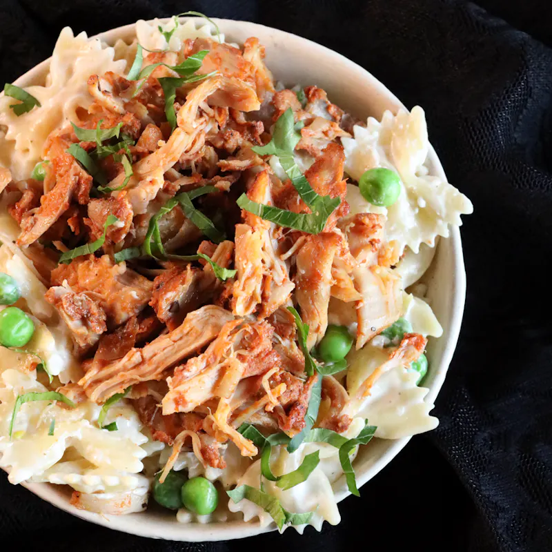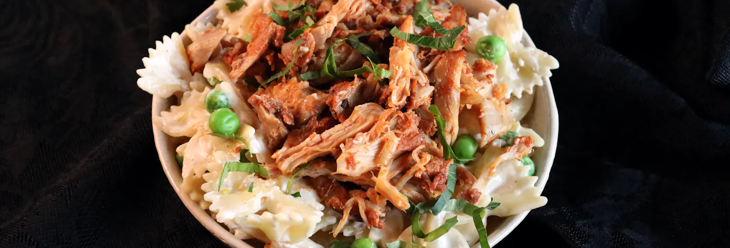 - Server pastaen toppet med Pulled Chicken og et dryss hakket persille.