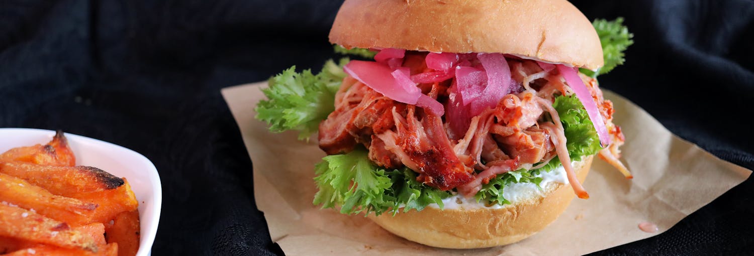 - Smør et lag majones på innsiden av burgerbrødene, legg på grønn salat, Pulled Pork og topp med litt syltet rødløk.