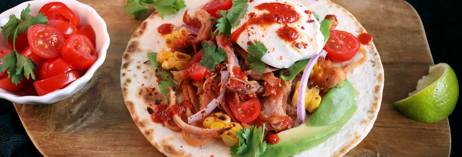 - Server tortillalafser med Pulled Pork, ristet mais, rødløk, tomat og avokado.